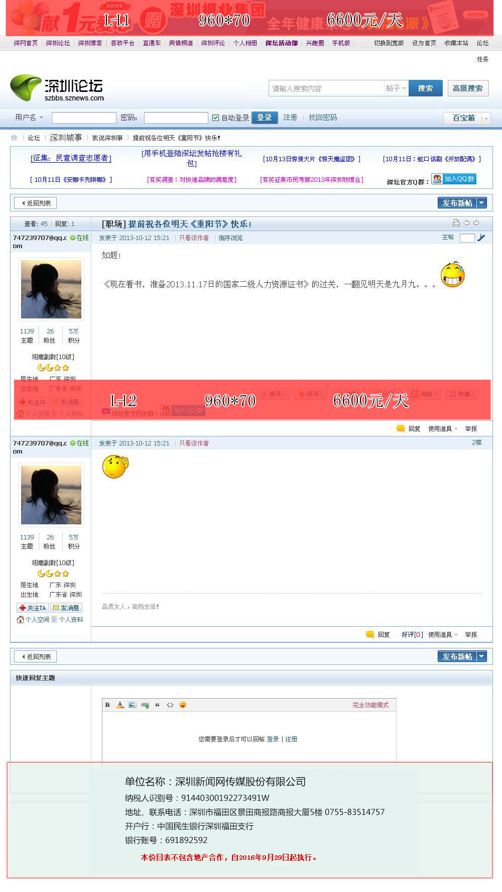 深圳新闻网独特优势: 传播力强:发挥深圳市对外宣传窗口的作用,是传播先进文化的重要阵地。 权威媒体:深圳报业集团主办,与报纸强势互动,在深圳综合网站及全国媒体网站中首屈一指。 构架完善:除整合15家报刊新闻资源,更有经济、文化、娱乐、体育等十余个专题频道。 用户广泛:内容丰富强大,符合用户心理与习惯,用户群增长快速、黏性强,用户活跃度、忠诚度极高。 互动性强:形式独特,与报纸平面媒体互动,广告增值效果好。 |
