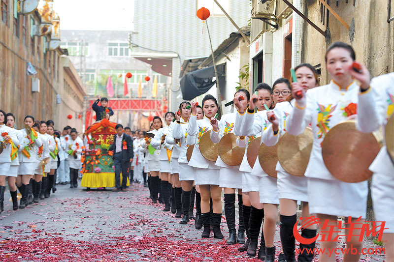 正月十六是汕头澄海区埔美社区三年一次的大巡游,锣鼓队的打扮明显也是现代化了,以前哪能露腿 林桂炎 陈小琳 摄