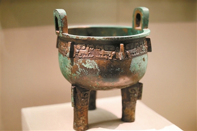 在此次展出的青铜器中,有一部分是仅铭有族氏铭文的,即家族的名号,以表示是该物品的所属人。代表族徽的铭文,象形的程度会比较高,主要用作礼器。比如展出的鸟父甲鼎,内里的铭文就是自上而下三个字,其中“鸟”字则几乎完全是鸟的象形,这个鸟就是鸟族的族徽,鸟族族群在当时十分庞大。而后面两个字就是“日名”,日名是指古人对逝人的称谓,一般以甲乙丙丁戊己庚辛壬癸十天干前加上受祭者的辈分格式出现。这种礼器又叫做日名器,既点明了受祭者,又表明了作器者和受祭者的关系。