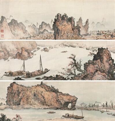 关山月白天外出写生,晚上整理写生画稿,获得了一大批写生作品。秀美的桂林山水激发了他的创作热情,引发了他的创作灵感,他觉得应该进行大的创作,把百里漓江两岸胜景尽收画卷之中。但是,他所住的七星岩公寓,又小又暗,只有一张小桌子,施展不开。而且,他还欠了一大笔租金,住不下去了。幸好得到李焰生的帮助,住进其家,得以在李家的客厅里作画,桌子不够宽,他就把纸铺在地板上蹲、趴着画。奋战了月余,终于完成了一幅32.8厘米×2850厘米的长卷《漓江百里图》,开创了广西的“漓江画派”风格。