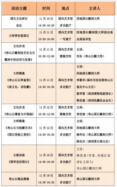 不仅如此,来自四地的国家级、省级工艺美术大师、非物质文化遗产传人将亲临深圳, 展览期间,举办名家对话论坛,开设两场名石雕刻艺术公开讲座,另逢周末将特邀两位国石大师在现场为观众导赏。