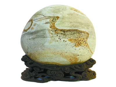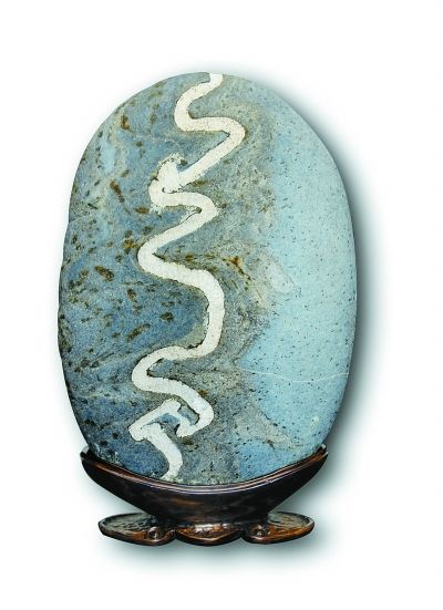 金沙江卵石的种类繁多,主要有芙蓉石、墨画石、油画石、龟纹石、螺钿石、松花石、丹彩石、牧羊石、金刚石、烫画石、彩蜡石、金沙彩等。这些石头到底有多好,水富县的石友们总结出十大美——天然美、色彩美、线条美、石质美、形象美、装饰美、朦胧美、含蓄美、空灵美、意境美。如果没有江水长年累月的冲刷和搬运,也就不会形成这么多美丽的石头。水富县奇石办多次组织当地的石商参加全国石展,几年来,捧回特等奖一枚,金奖185枚,银奖420枚,优秀奖600枚。好像是在夸自己,曹会长说得有些脸红,用手拍打起石头来。在一旁的老伴儿说,老曹一高兴就爱拍石头,说石头能听懂他的话。这倒让我想起著名美学家王朝闻赞美奇石的一首诗:“石居人外,人在石中。相击相和,创造对方。”