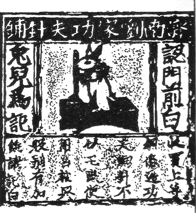在中国国家博物馆,陈列着一块北宋年间“济南刘家功夫针铺”用来印刷广告的铜雕版,其长12.4厘米,宽13.2厘米,画面正中是一只站立捣药的白兔,左右注明“认门前白兔儿为记”,这是在告诉买家“一定要认准本店的白兔捣药商标进行选购”;白兔下方广告文辞称:“收买上等钢条,造功夫细针,不误宅院使用。转卖兴贩,别有加饶,谓记白”,意思是说:“我们家用最好的原材料,花费功夫造针,使用方便。如果有人想批发转买,还可以优惠,但要告诉买者或注明是白兔牌的产品”。这件“济南刘家功夫针铺”铜雕版是已知世界上最早出现的商标广告实物。宋代使用铜版印刷的广告,既可以做产品的包装,也可以做广告招贴的海报或者传单,这种纸单在宋代叫“仿单”或“裹贴”。