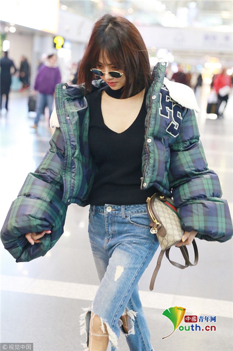 2017年12月8日,北京,蔡依林现身机场,她身穿夸张的格子羽绒服,袖子能藏雷成功拥有“麒麟臂” ,不知是不是在cos铁臂阿童木。她身穿深V内搭秀胸前春光,气场全开似走秀,牛仔裤里似乎套着透明“秋裤”,凹造型不忘保暖!