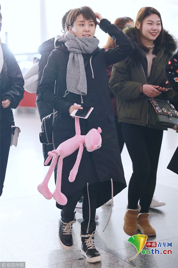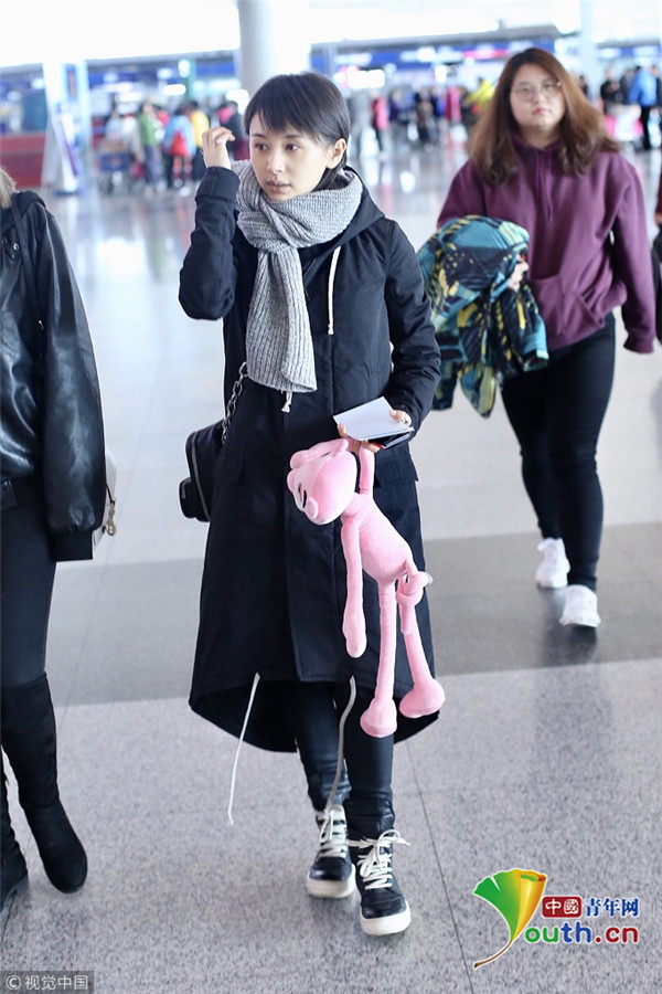 2017年12月10日,北京,王子文现身机场,裹围巾羞涩挠头,少女感十足,提溜粉丝所赠“粉红豹”童心未泯。
