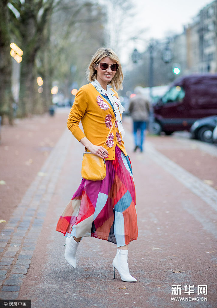 近日,德国杜塞尔多夫,时尚博主Gitta Banko街拍。她戴Miu Miu茶色墨镜,身穿Steffen Schraut橘色亮片拼贴针织开衫,内搭Steffen Schraut白色蝴蝶印花系带雪纺衬衫,Steffen Schraut拼色百褶纱裙,肩背Volker Lang橘色口金包,脚踩Kurt Geiger白色尖头高跟短靴。