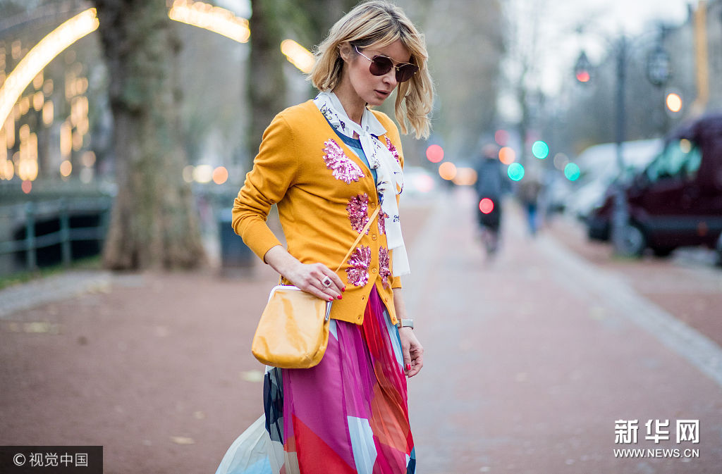 近日,德国杜塞尔多夫,时尚博主Gitta Banko街拍。她戴Miu Miu茶色墨镜,身穿Steffen Schraut橘色亮片拼贴针织开衫,内搭Steffen Schraut白色蝴蝶印花系带雪纺衬衫,Steffen Schraut拼色百褶纱裙,肩背Volker Lang橘色口金包,脚踩Kurt Geiger白色尖头高跟短靴。