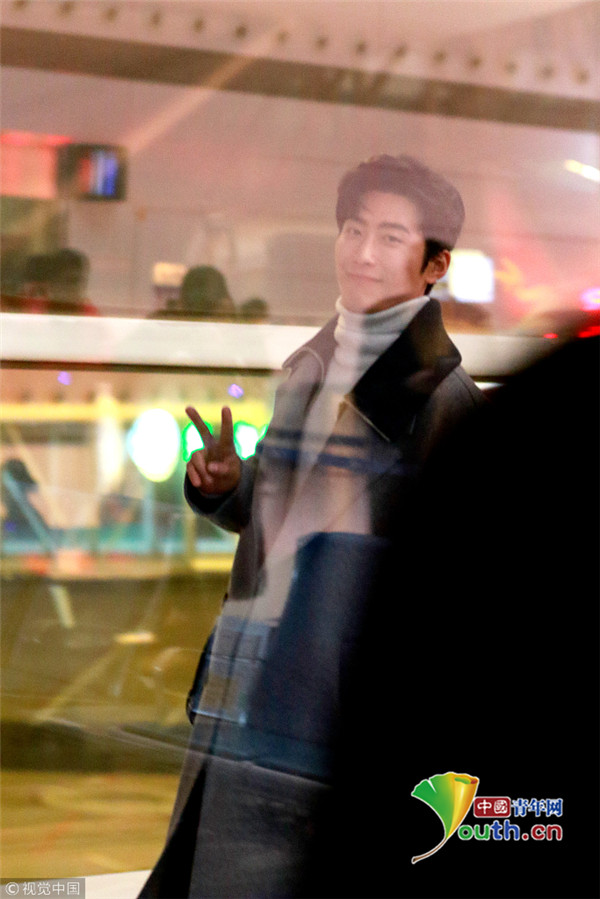 2017年12月11日,无锡,窦骁灰大衣帅气现身无锡机场,见摄影师拍图隔着玻璃比V,暖男无疑了!