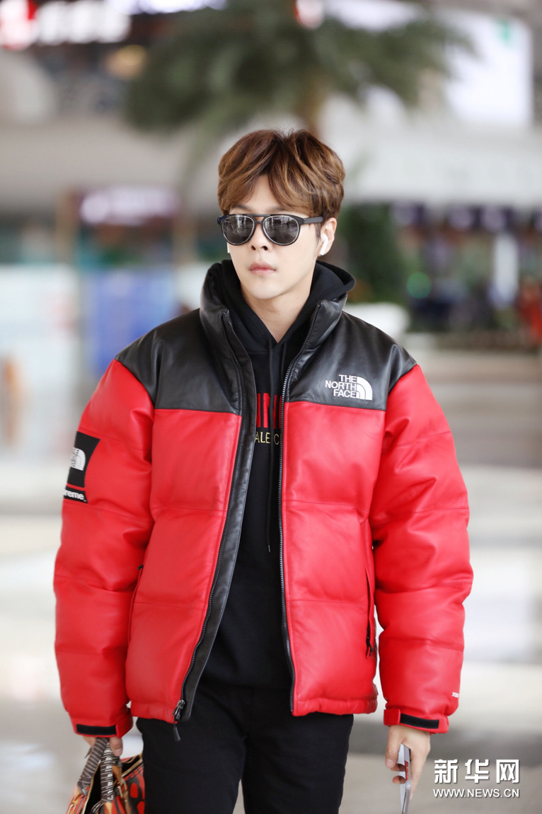 徐海乔机场秀大长腿 红色羽绒服个性时髦