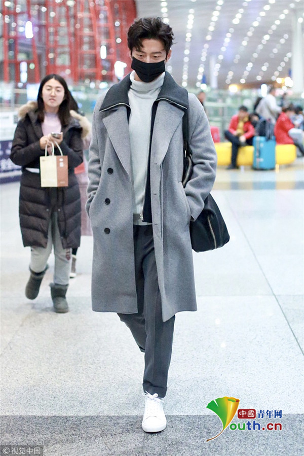 2017年12月13日,北京,窦骁身着灰色大衣、戴口罩现身机场,为粉丝大方签名,见镜头开心比V挥手亲和力满分。
