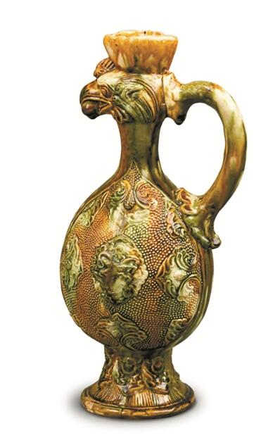 三彩印珍珠地贴兽面纹凤首壶。
