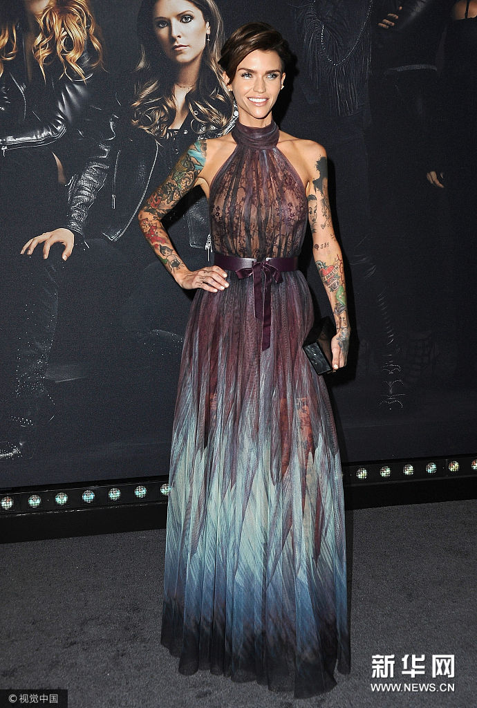 近日,美国好莱坞,众明星参加电影《完美音调3》首映礼。 鲁比·洛斯(Ruby Rose)身穿渐变深紫色削肩挂脖透视蕾丝纱裙,系紫色腰带,手拿黑色亚克力手拿包。