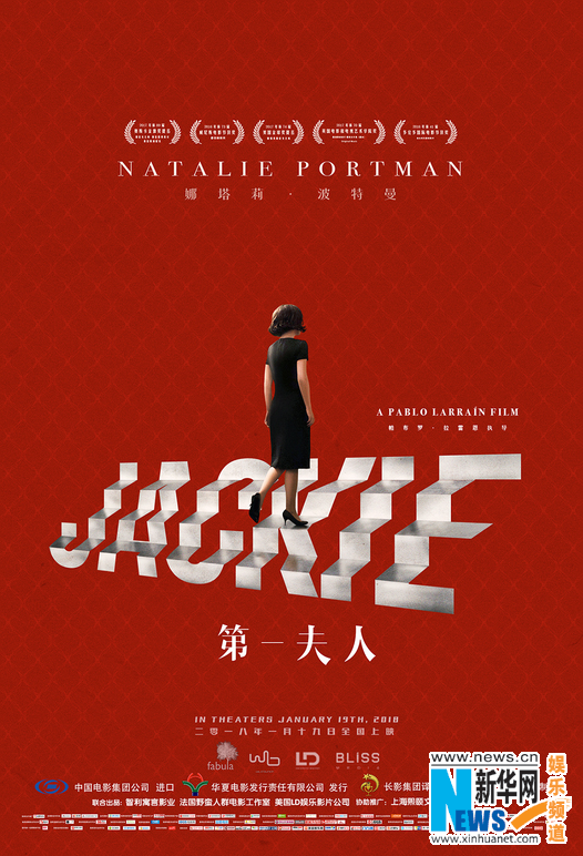 此次曝光的海报巧妙喻示了肯尼迪遇刺后总统夫人杰奎琳的人物心理状态。海报中由娜塔莉·波特曼,在由自己名字组成的阶梯上艰难攀登,一席黑色连身裙整洁朴素,在鲜红色的背景中显得孤独神秘,同时也暗藏危机,虽背影示人,但读出了优雅自信,似乎已放下内心的秘密与束缚,坦然面对命运带来的一切。