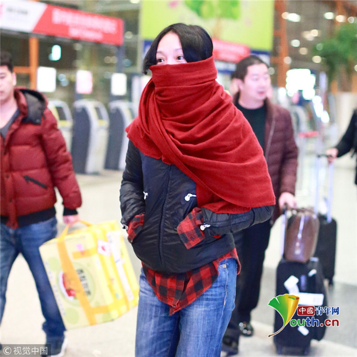 北京,周迅身着黑色棉衣、牛仔裤低调现身某机场,红色围巾包裹严实难遮好气色,大步流星气场满分。