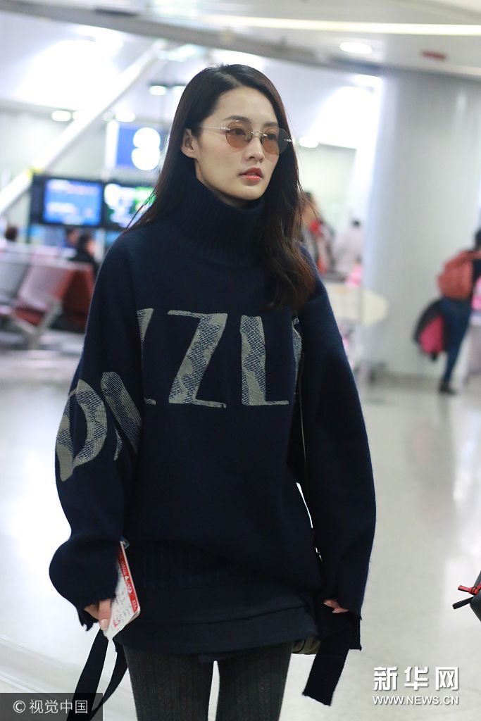 李沁高领毛衣 戴茶色墨镜温暖时尚