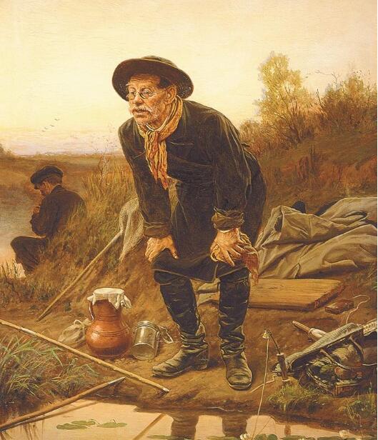作为当时的核心人物,彼罗夫喜欢在日常生活题材的作品中表现微小人物。《钓鱼者》描绘了一位憨态可掬的老年男子,帽子上抬,全神贯注地注视着浮标。