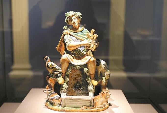 还有一些作品直接被塑为人形,比如16世纪末,由乌尔比诺的潘塔纳兹工坊所作的人像水罐,表现的是传说中半人半神的奥菲欧弹奏竖琴迷惑动物,他坐在一个圆桶上,液体从桶下方的小孔流入池中。据克劳迪娅·卡萨利介绍,这件产品专为私人居所而设计,可能在豪奢的宴会上用作烈酒容器。
