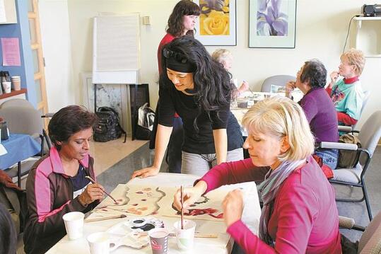 在医院艺术治疗室,刘简教癌症病友画中国水墨画。