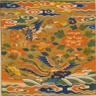 鸾凤与牡丹、湖石、祥云相配称“凤穿牡丹”或“凤戏(喜)牡丹”,佳节初岁时寓意四季平安、富贵吉祥。而成对出现的凤凰与花卉又有赞颂夫妇恩爱、富贵白头之意。现藏美国大都会博物馆的明人缂丝凤穿牡丹方补原缀明代内命妇吉服,穿用于庆典朝会。方补中一对缂丝彩凤被安置在山花树石佳景之中,丛生的灵芝、山茶、梅花、牡丹皆有吉祥寓意。这样题材的缂丝补子亦见清华大学艺术馆藏,可见在明代使用富有节庆特色的补子颇为常见。
