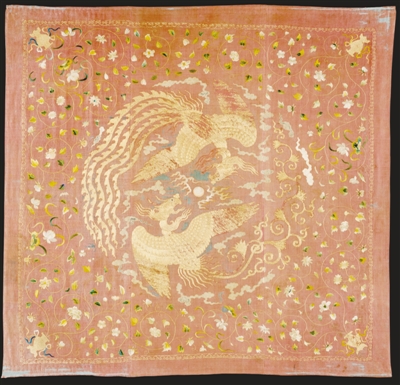 明清时期,羽翼华丽的凤凰从遥远的天上下降凡间,将一切美好洒向人间,这一时期织物上常见以缠枝花卉纹样搭配鸾凤、对凤之装饰手法,或配上菊花、莲花、牡丹等人们喜闻乐见的四季平安花卉,凤穿牡丹、凤踏莲花、龙凤翔云等等吉祥纹样以写实手法细腻的表现,无疑体现古人的思想和审美。