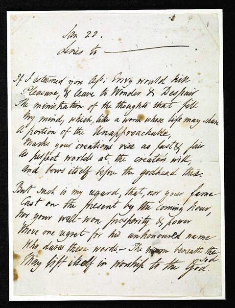 ▲珀西·比希·雪莱的《致拜伦的十四行诗》草稿。