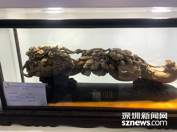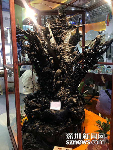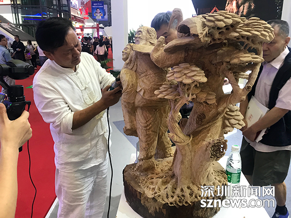 宋智勇以“孝”为创造源泉,把孝道文化和地方特色元素相融合,捕捉生活细节,完美植入雕刻工艺中。今年他更是将根雕工艺带到了文博会现场,为观众演示一个根雕作品的诞生。