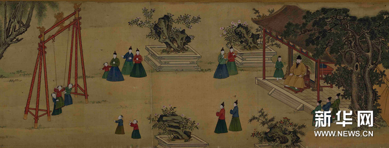 与明代帝王有关的行乐图,目前存世有数幅,如中国国家博物馆藏《宪宗元宵行乐图》、北京故宫博物院藏《明宣宗行乐图》卷等。此幅《四季赏玩图》,曾在大英博物馆“明:皇朝盛世五十年”展览中展出。画卷描绘皇室四季赏花行乐的场景,春日赏牡丹、夏季赏红莲、重阳赏金菊、冬季赏雪梅。头戴黑色便帽、身穿绣金龙袍的宪宗皇帝,前后共5次出现在画面里。松树亦出现在各个桥段,扮演重要角色:一开始,宪宗皇帝坐在双松下的草堂里观看女童荡秋千;春赏牡丹时,宪宗所坐的琉璃凉亭外,被古松围绕;秋冬交界处,以青松和雪松表示季节的变化,雪松下的便殿也银装素裹,宪宗也换上棉袍,戴着貂皮帽。画面瑰丽堂皇,一派太平喜乐氛围。