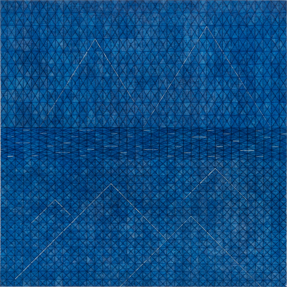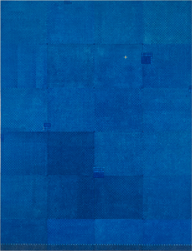 2017年出现的蓝色系列新作则证明了李文光在艺术形式多样性上的探索。与之前的作品比较,新作继续保留了原有满幅的几何构成,但在抽象表达的形式中出现了较为具象的图像,打破了艺术家以往那种相对均质的构图模式,如《界河》的山与河的形象、《雨雪》中的云与雨的形象,让作品产生了核心主旨和视觉聚焦的效果。