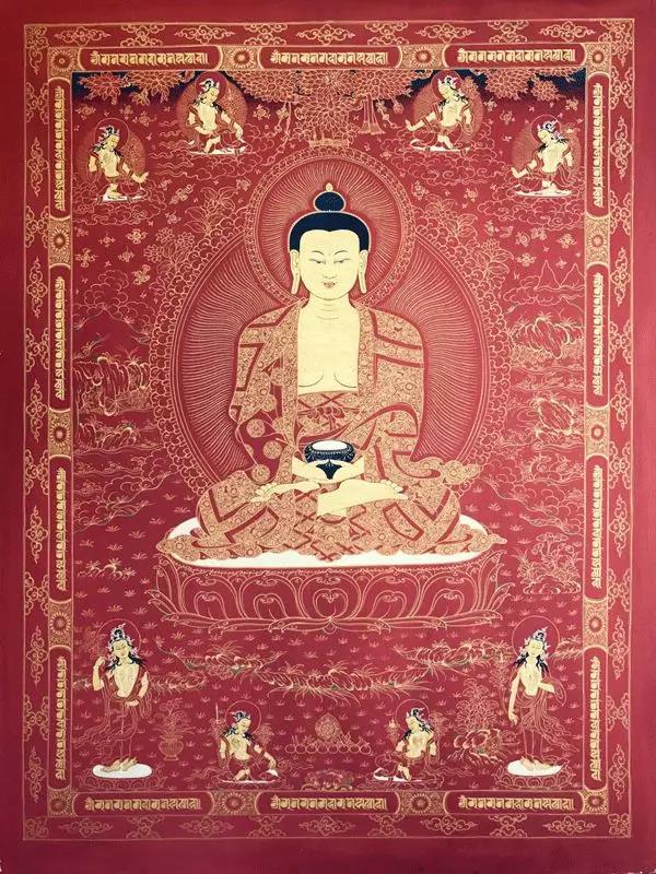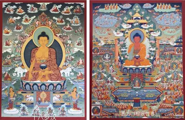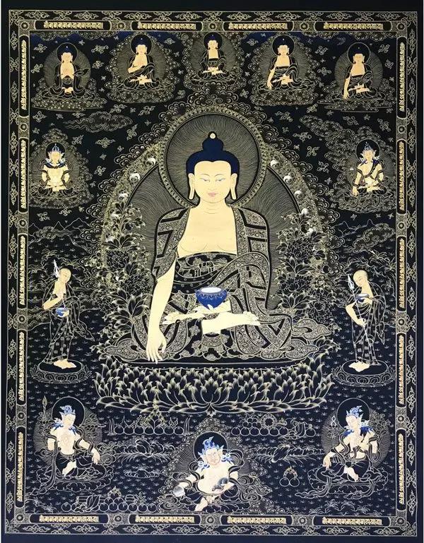 "唐卡"系藏文音译,指用彩缎装裱后悬挂供奉的宗教卷轴画,是藏族文化中一种独具特色的绘画艺术形式,其题材内容涉及藏族的历史、政治、文化和社会生活等诸多领域,堪称藏民族的百科全书。唐卡的绘画过程工序繁多,一副唐卡往往需要几个月,甚至几年的时间才能完成。