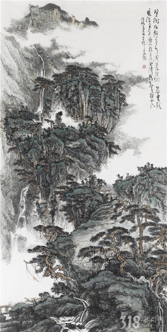 我以为,范阳先生是真正在心性上贴近古人“不下堂筵,坐穷泉壑”,其现居赣中名岳武功山、杨岐山之中。尤其武功山,史上与衡山、庐山并称江南三大名山,被冠以“衡首庐尾武功中”,山脉绵延浩瀚,茫茫无际。范阳先生终日面山临壑,弄笔自适,得武功真容。山水画从来就不是简单的描摹自然的风光,无论丘园养素还是泉石啸傲,都是画者精神的自然流露,这是画家笔墨情态的表达,亦是画家艺术境界追求的体现。对于山林的描绘,承载了画者对泉石意趣的向往,对于林下境界的追求。范阳先生的山水画作品长于布景,对山中的“阴、晴、朝、夕”的细腻描绘都有他自已独特感悟和表达。笔下极丘壑浩渺之势,奇峰罗列,宛有风骨,深壑幽谷,其势超峻;至于松柏掩映,峭壁涌泉,野道幽麓,于野逸之态甚备。范阳先生数十年来遍临南北宗诸家,远溯元人四家,清初四王,近至黄秋园,上下求索,崇穆有加,最终归皈真逸正脉。新近年逾七十之作,日渐精熟,苍腴古厚,更趋融古化古之态,细究其笔下踪迹:子久?麓台?秋园?各不相肖,而莫不精备。谛观其中景象:匡庐?武功?罗霄?浑然而化,不一而足。如此境地当称“妙解”。