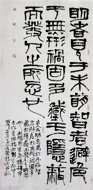 王和平以手指蘸墨,以手为笔,或疾或缓,不到十分钟,一幅恰似石凿雕刻力透纸背的书法作品跃然纸上,其变幻莫测的创作手法和独特风格令人叫绝。显然,用手指画的难度比用笔画大得多。一般书写一个字需要用手指蘸墨几次以上,但又必须使字形整体合理自然,笔画形式流畅灵动,不至于显露手工痕迹,不至于给人以呆滞和工艺性强的感觉。要恰到好处地体现笔画的紧凑、粗细、虚实、枯荣,是一件很不容易的事。功夫全在指头,既非一日之功,也非人人可以练就。