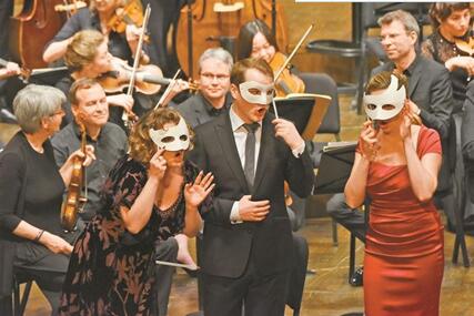 经过对歌剧《唐璜》的严谨考证,勒内·雅各布斯以鲜活的“古乐”形式还原了早期古典主义歌剧的音乐特质。据凯撒介绍,昨晚的演出与以往歌剧表演有很大不同。音乐会版的歌剧《唐璜》中,乐团、指挥、独唱与合唱团都在舞台上,演员不仅会在台前演唱,还穿梭在乐团中,带来生动的演出。