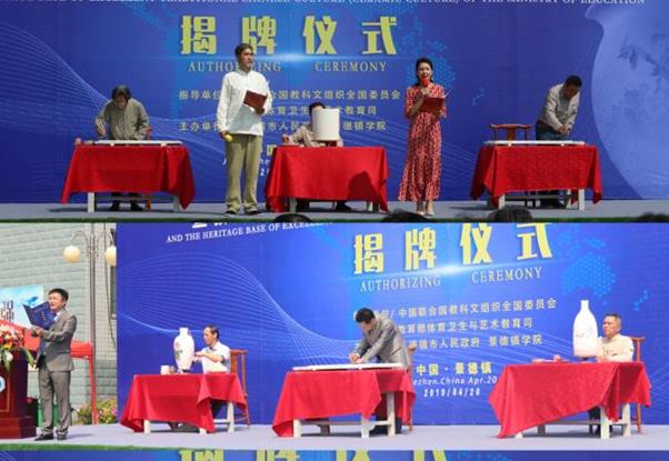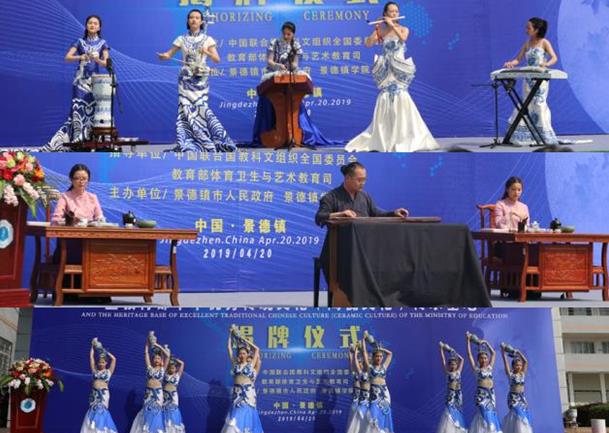 4月20日上午,由中国教科文组织全国委员会,教育部体育卫生与艺术教育司共同指导,景德镇市人民政府,景德镇学院共同主办的“陶瓷文化保护与创新”教席暨教育部中华优秀传统文化“陶瓷文化”传承基地揭牌仪式在景德镇学院陶艺中心广场隆重举行。景德镇市委书记钟志生,景德镇市委副书记、市长刘锋,教育厅副巡视员张爱萍,校长陈雨前等出席仪式并共同为教席基地揭牌。仪式由副校长吴丁主持。揭牌仪式后举行了文艺汇演。