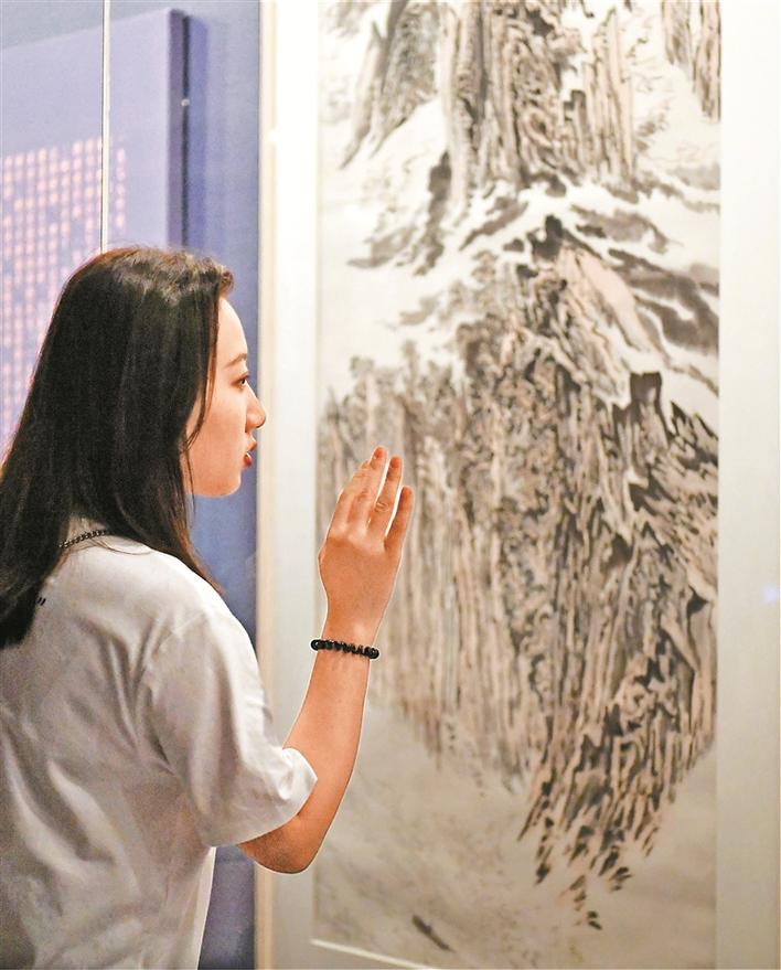 展览一经推出,就迅速吸引了络绎不绝的市民前来参观。面对暑期人流量大的情况,关馆特地推出了丰富多样的公共教育服务。不仅有志愿者导览,还有亲子工作坊、数字化设计等等,内容接地气,趣味横生。记者看到不少孩子都在家长的指引下拿着画本在美术馆里临摹、学习,通过这种方式与国画家们一起交流切磋。