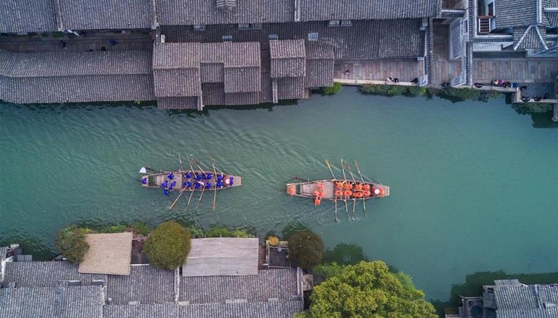 3月29日,乌镇水乡百姓在乌镇西栅景区参加名为“踏白船”的传统水上竞技活动,吸引游客前来感受水乡独特的民俗风情。