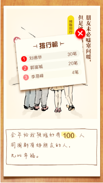 如果说红包是一份祝福一份喜悦,那往你银行卡里打“巨款”的都是真爱。在转账方面,第三方平台的年度账单只告诉我们的红包发给了谁,招商银行的年度账单却能给你个转账排行榜,告诉你谁给你转账的次数最多。异地恋三年的小林,最近在朋友圈发了份单身狗粮:看了我招行年度账单的转账排行榜,给我转账最多的还是TA,遇到这样的男人,真是不嫁不行了。一众朋友均被闪瞎,纷纷表示:公众场合莫秀恩爱,爱护单身狗人人有责。