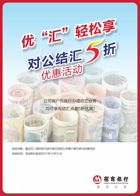 近日,记者从招行深圳分行了解到,自2017年8月1日至2017年年底,招商银行深圳分行特别推出结汇尊享优惠活动。活动期间,凡公司客户,可在招商银行深圳分行辖内(含珠海分行及惠州分行)任一网点通过扫描指定二维码进行登记,登记后办理结汇业务即可享受结汇点差五折优惠。(张怡)