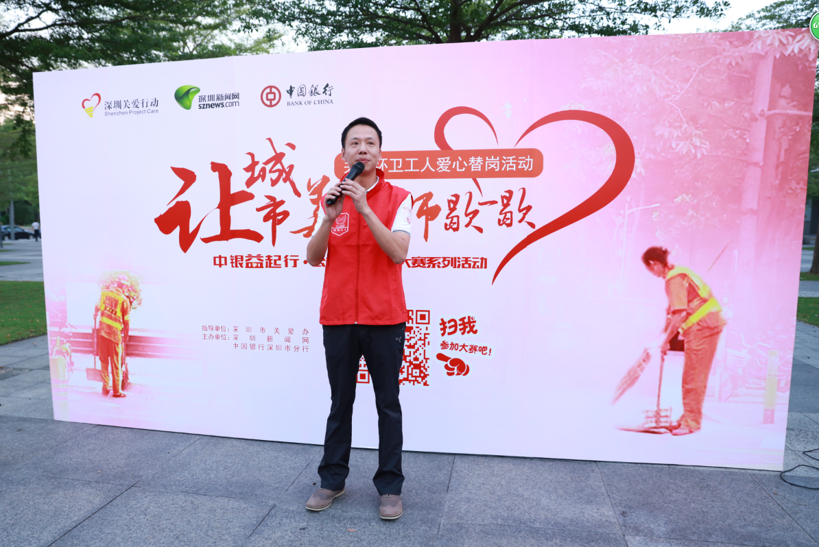 据了解,本次“爱心替岗”不仅是城管局发起的公益活动,同时也是由深圳市关爱行动组组委会办公室、深圳新闻网、中国银行深圳分行联合发起的手机公益摄影大赛“中银益起行 最温暖的瞬间”的第二场公益活动。该活动旨在通过策划举办系列公益活动,号召市民关注记录身边人扶贫济困、孝顺父母、城市文明、环境保护、邻里和睦等温暖瞬间,传递社会温情,提升生活幸福指数。