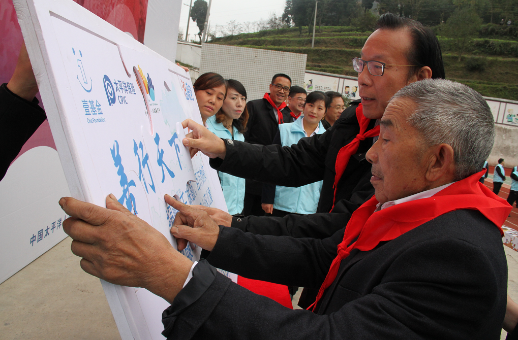 中国太保寿险董事长徐敬惠与老书记黄大发共同完成“善行天下”拼图