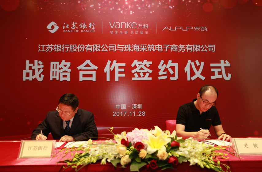 11月28日,采筑电商平台发布会暨与江苏银行战略合作协议签约仪式在前海万科国际会议中心成功举行。万科集团副总裁王蕴女士和江苏银行运营总监赵辉先生受邀出席仪式并致辞,江苏银行行长助理兼深圳分行行长李敏与采筑电商平台总经理都军代表双方签署战略合作协议。总行公司业务部周爱国总经理、深圳分行张庆光副行长等一行出席发布会暨签约仪式。