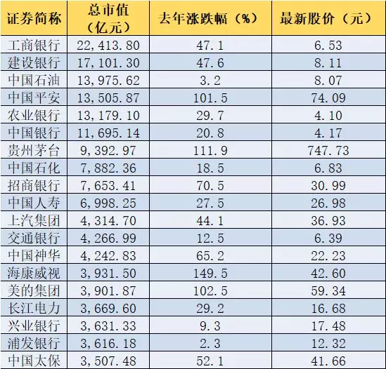 据汇大数据终端统计,截止到今年3月20日,中国平安的市值为1.35万亿,仅次于工商银行、建设银行和中国石油。在市值排名前20名的公司中,去年全年股价涨幅在100%以上的公司仅有4家,分别是海康威视、贵州茅台、美的集团和中国平安,涨幅分别为149.5%,111.9%、102.5%和101.5%。