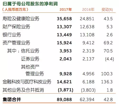 除了个人业务的大放异彩,平安集团的核心金融业务也是年报的一大亮点。2017年,中国平安的寿险及健康险新业务价值大增32.6%,内含价值营运回报率35.5%;产险市场份额提升1.3个百分点;银行零售业务净利润占比提升至67.6%。