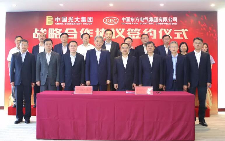 光大集团董事长李晓鹏、副总经理蔡允革、董事会秘书叶振勇;东方电气董事长邹磊、副总经理朱元巢、副总经理徐鹏见证签约。光大集团副总经理葛海蛟、东方电气总会计师白勇代表双方签约。