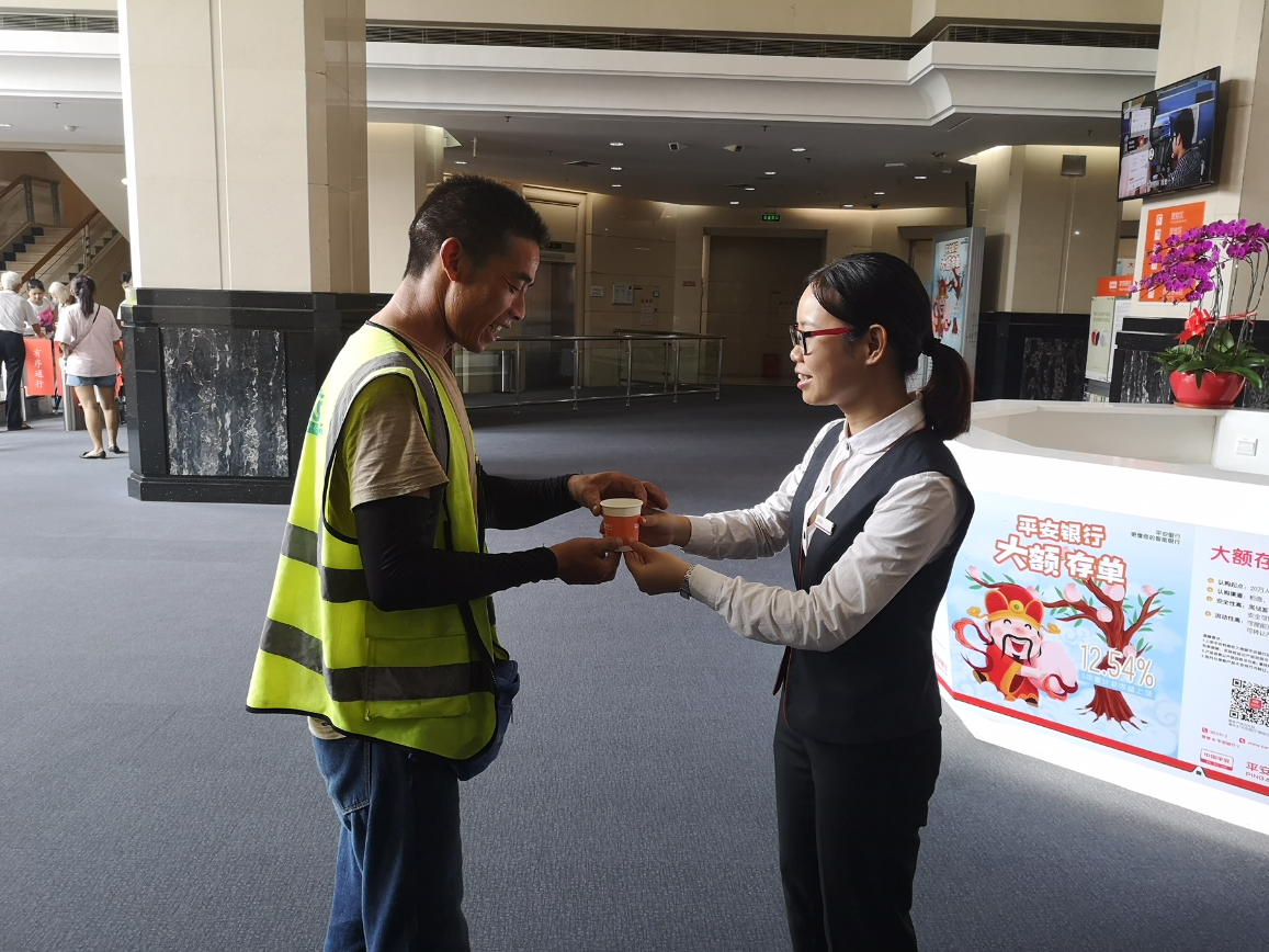 据悉,深圳各家平安银行网点都在门口跑马屏设置了宣传标语,欢迎户外高温作业者进入网点避暑休息、喝水防暑。不少网点还特别准备了清凉饮品如花果茶、大麦茶、苦荞茶等,并配备了必要的防暑药品。分行工作人员还主动邀请环卫工人与快递员到室内避暑休息,给他们递上一杯茶水,温馨提醒他们一定要多喝水、注意防暑,并向他们的辛勤工作表达敬意。