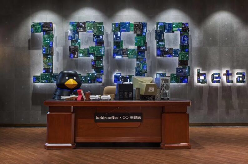 瑞幸咖啡腾讯QQ主题店距离腾讯全球总部所在地滨海大厦不到两公里。咖啡店充满互联网怀旧特色,摆放着腾讯20年前创业伊始的第一张办公桌复刻版,怀旧打卡的立柱上装饰有充满时代特色的QQ聊天对话框,在这里还可以听到复古的QQ提示音。1999年,QQ beta版(测试版)上线,历经多次迭代目前月活用户达8亿,成为全球最大的通讯社交平台之一。