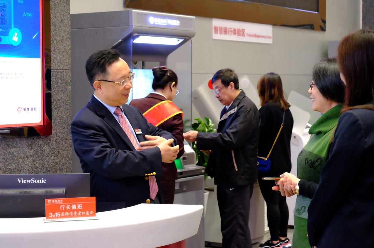 3月15日当天,招商银行深圳分行开展了“党委班子下基层”之“当值大堂经理”活动。分行党委班子成员以普通党员身份深入一线,到营业网点大堂“戴党员徽章、亮身份、作表率”,联合支行行长队伍,通过率先垂范宣传消保知识,鼓励基层党员和群众共同关注消费者声音,前来办理业务的客户纷纷表示感受到招商银行真诚贴心的服务,犹如春日里缕缕阳光,温暖着客户的心。