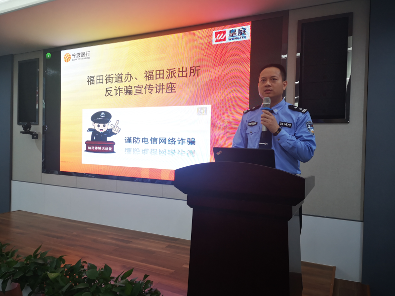 深圳新闻网讯 近年来,信息诈骗案件多发,诈骗分子手段层出不穷,不仅给广大市民造成了财产损失,更加将社会的反诈骗宣传教育工作推向重要位置。为了普及广大金融消费者的反诈骗知识,同时让知识宣传更接地气,近日,宁波银行深圳分行携手深圳福田街道办、福田派出所对皇庭中心大厦100多位商户代表,开展了一场教育意义深刻的反诈骗知识讲座。福田区副所长罗跃、福田派出所社区队队长莫予宝、福田街道办政法办主任马建忠、皇庭物业总经理吴海兵、宁波银行深圳分行监察保卫部副总经理陈久桐等9位警银领导代表出席了本次活动。