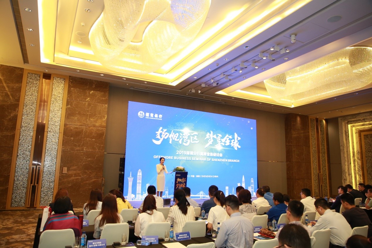 ]2019年8月30日,在总行和分行领导的精心指导与大力支持下,由总行离岸金融中心主办,深圳分行承办的“扬帆湾区梦享全球”2019年离岸业务研讨会在深圳四季酒店盛大举行。