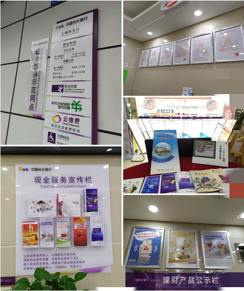 上梅林支行积极响应人民银行号召,采取多种措施提升网点的现金服务水平,实现了“六个统一”,完善优化叫号系统的设置,增加了残损人民币兑换和现金券别调剂业务并对应至相应的服务专窗,并为现金服务专窗配备了性能优良的现金处理机具。在营业厅配置了硬币兑换一体机,简化了纸硬币清点兑换的手续缩短客户等待时间。在网点门前LED屏连续滚动播放现金宣传用语,在厅堂布置现金服务宣传栏,并在厅堂醒目位置摆放现金服务等相关宣传手册,供办理业务的客户们利用等候时间或是通过厅堂微沙龙,关注了解人民币的鉴别方法和人民币反假宣传材料,适时向公众普及金融知识。