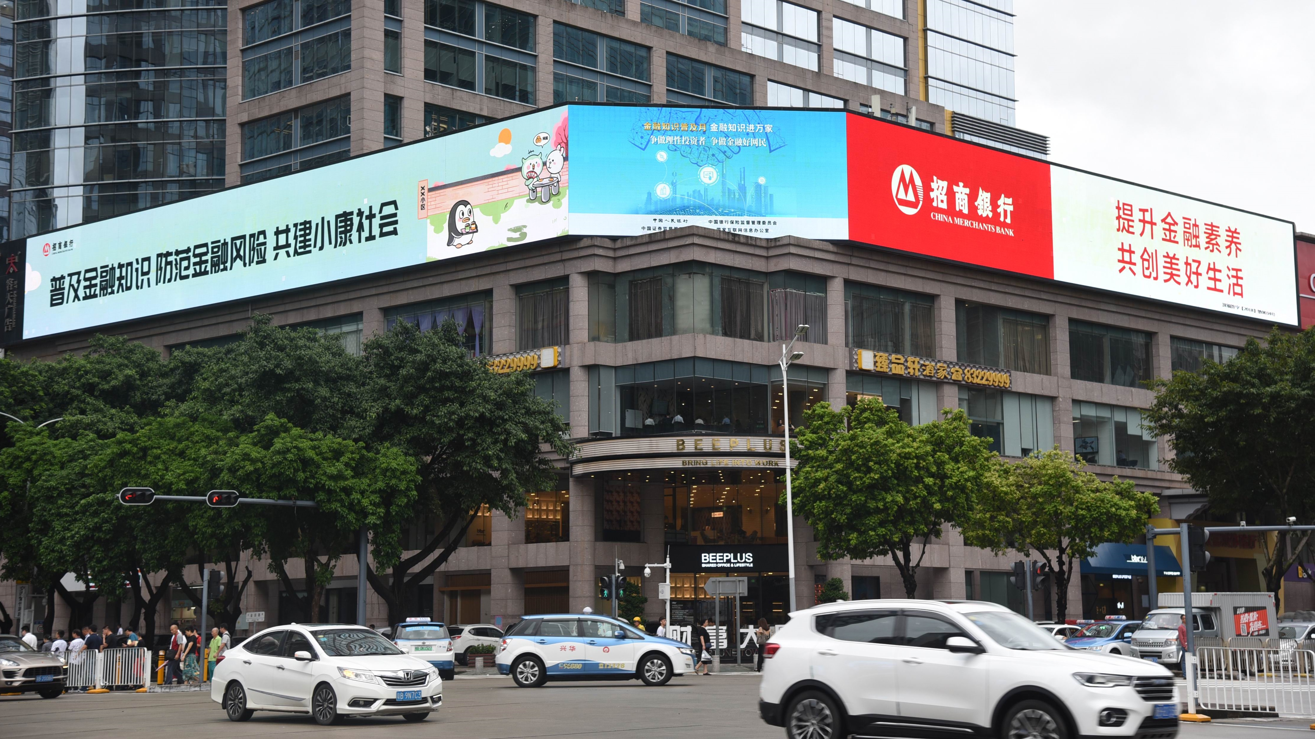招商银行除布局全辖网点营业厅滚动播放活动口号、总分行特色金融宣教片外,同时在财富大厦三面LED电子屏投放大型户外广告,进一步扩大宣教受众面,消保品牌宣传效果显著。